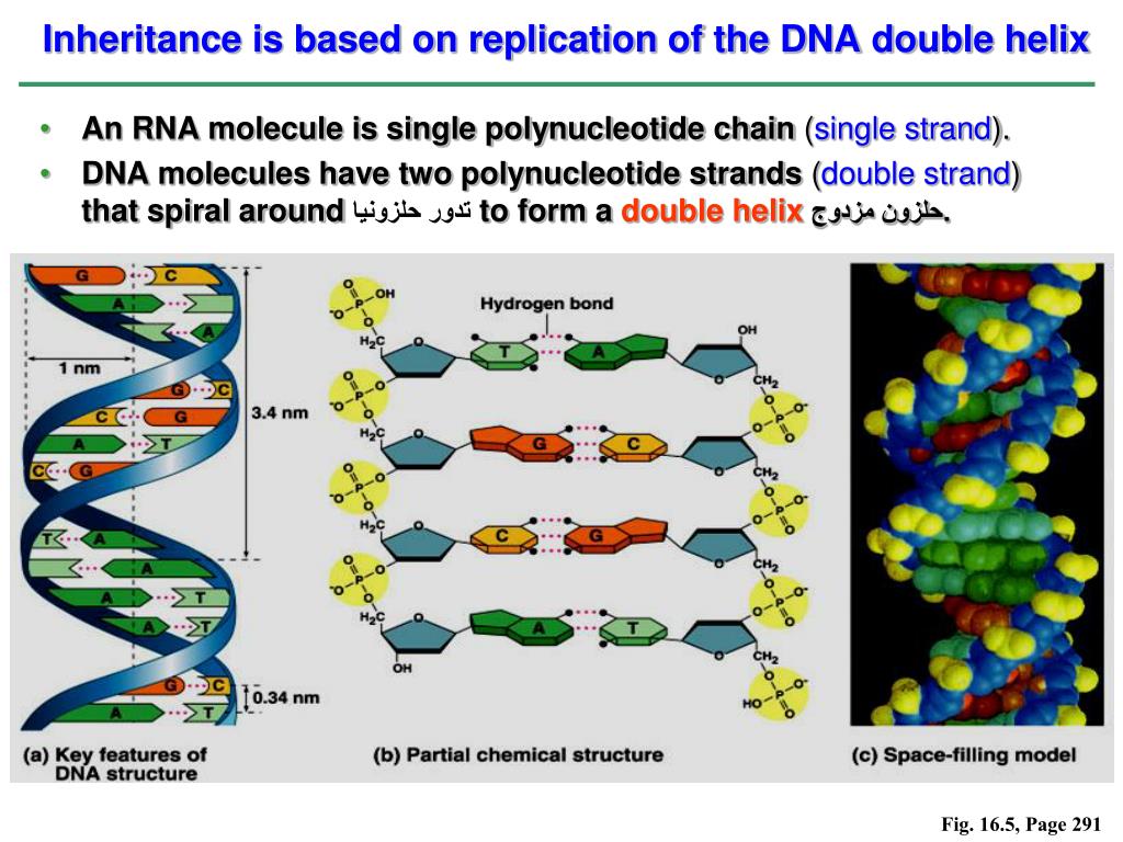 Inheritance is based on replication of the DNA double helix • An RNA molecule is single polynucleotide chain (single strand). • DNA molecules have two polynucleotide strands (double strand) that spiral around تدور حلزونيا to form a double helixحلزون مزدوج. Fig. 16.5, Page 291