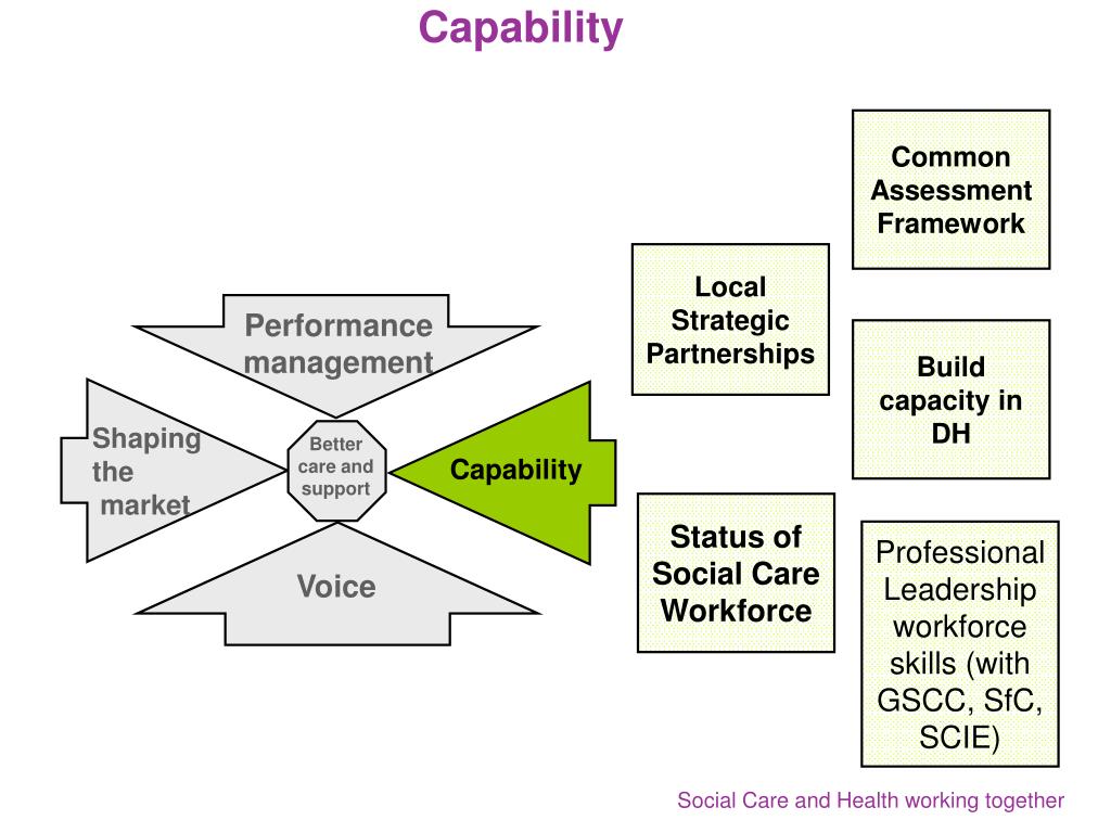 Capability Common Assessment Framework Local Strategic Partnerships Performance management Build capacity in DH Shaping the market Better care and support Capability Status of Social Care Workforce Professional Leadership workforce skills (with GSCC, SfC, SCIE) Voice