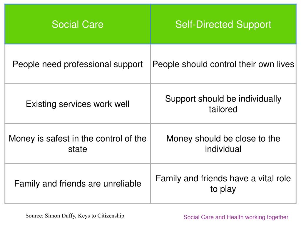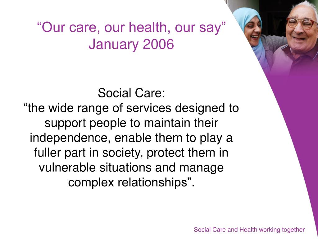“Our care, our health, our say” January 2006 Social Care: “the wide range of services designed to support people to maintain their independence, enable them to play a fuller part in society, protect them in vulnerable situations and manage complex relationships”.