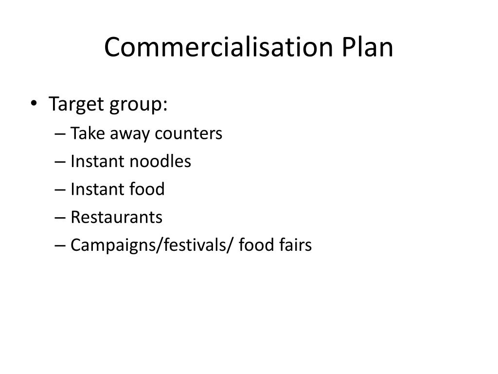 Commercialisation Plan • Target group: • Take away counters • Instant noodles • Instant food • Restaurants • Campaigns/festivals/ food fairs