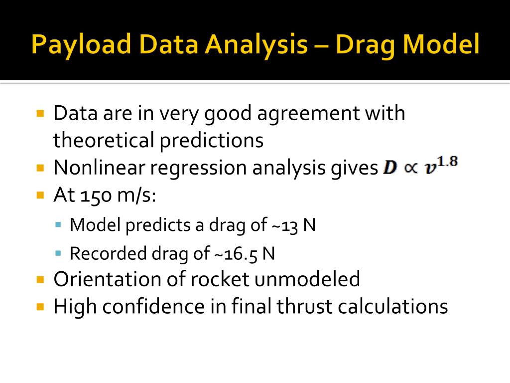 Payload Data Analysis – Drag Model • Data are in very good agreement with theoretical predictions • Nonlinear regression analysis gives • At 150 m/s: • Model predicts a drag of ~13 N • Recorded drag of ~16.5 N • Orientation of rocket unmodeled • High confidence in final thrust calculations