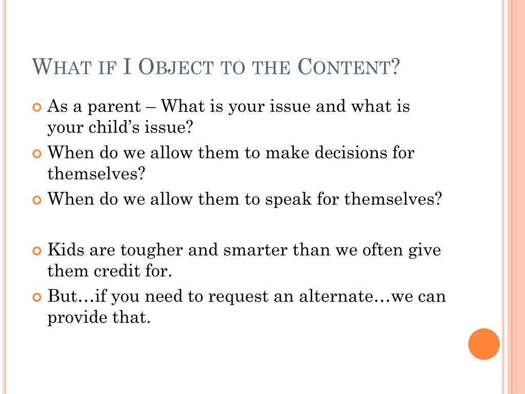 What if I Object to the Content? • As a parent – What is your issue and what is your child’s issue? • When do we allow them to make decisions for themselves? • When do we allow them to speak for themselves? • Kids are tougher and smarter than we often give them credit for. • But…if you need to request an alternate…we can provide that.