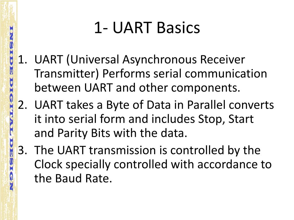 1- UART Basics • UART (Universal Asynchronous Receiver Transmitter) Performs serial communication between UART and other components. • UART takes a Byte of Data in Parallel converts it into serial form and includes Stop, Start and Parity Bits with the data. • The UART transmission is controlled by the Clock specially controlled with accordance to the Baud Rate.