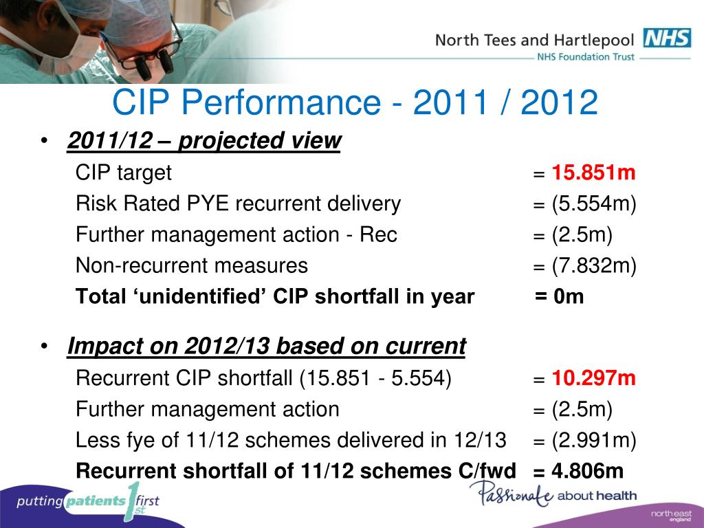 CIP Performance - 2011 / 2012 2011/12 – projected view CIP target = 15.851m Risk Rated PYE recurrent delivery = (5.554m) Further management action - Rec = (2.5m) Non-recurrent measures = (7.832m) Total ‘unidentified’ CIP shortfall in year = 0m Impact on 2012/13 based on current Recurrent CIP shortfall (15.851 - 5.554) = 10.297m Further management action = (2.5m) Less fye of 11/12 schemes delivered in 12/13 = (2.991m) Recurrent shortfall of 11/12 schemes C/fwd = 4.806m
