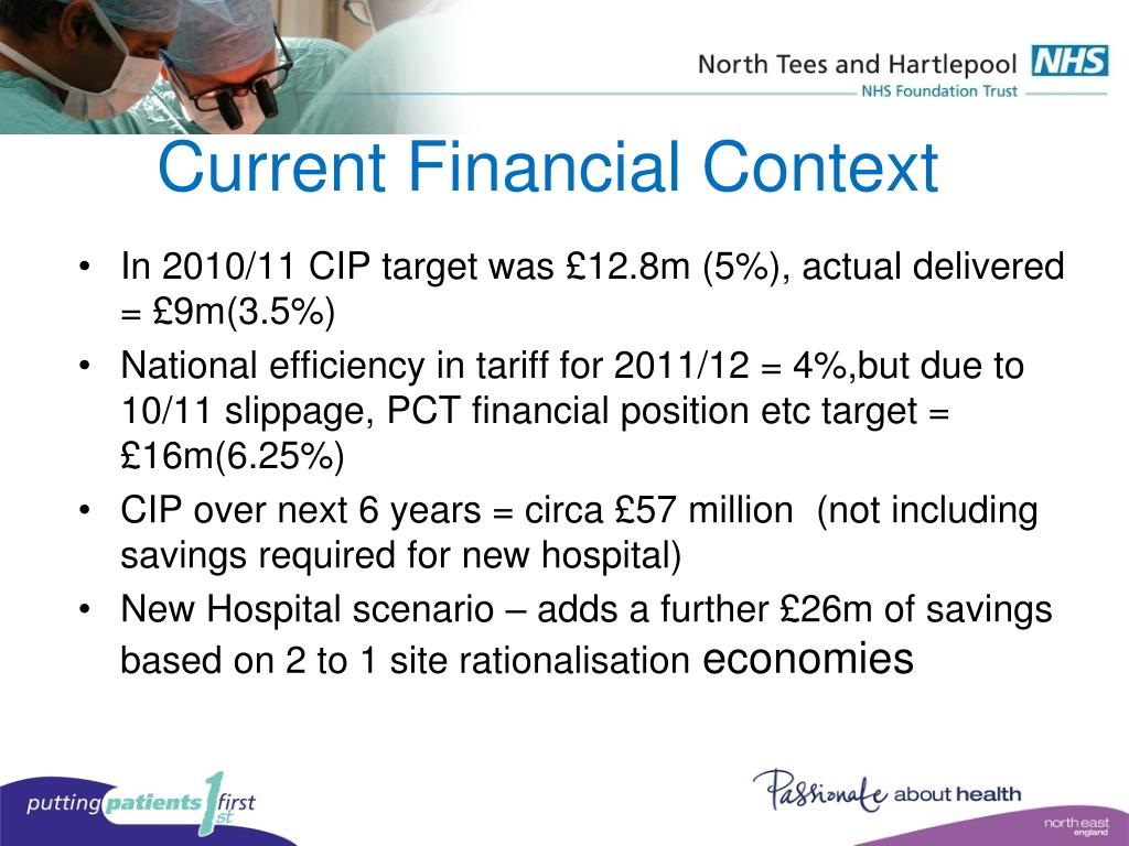 Current Financial Context • UK economic climate • NHS implications – minimal growth for next 5 years (Tariff Deflation) • DH need to generate cost efficiencies of £20bn • Projected savings target for Teesside of £200m by 2014