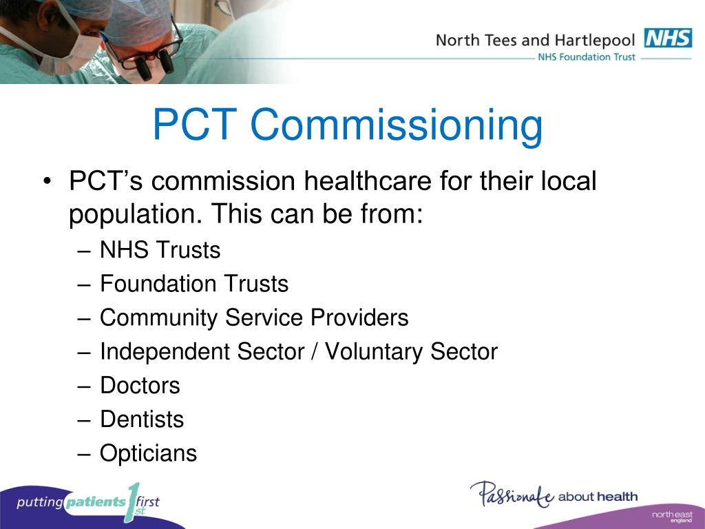 PCT Commissioning • PCT’s commission healthcare for their local population. This can be from: • NHS Trusts • Foundation Trusts • Community Service Providers • Independent Sector / Voluntary Sector • Doctors • Dentists • Opticians