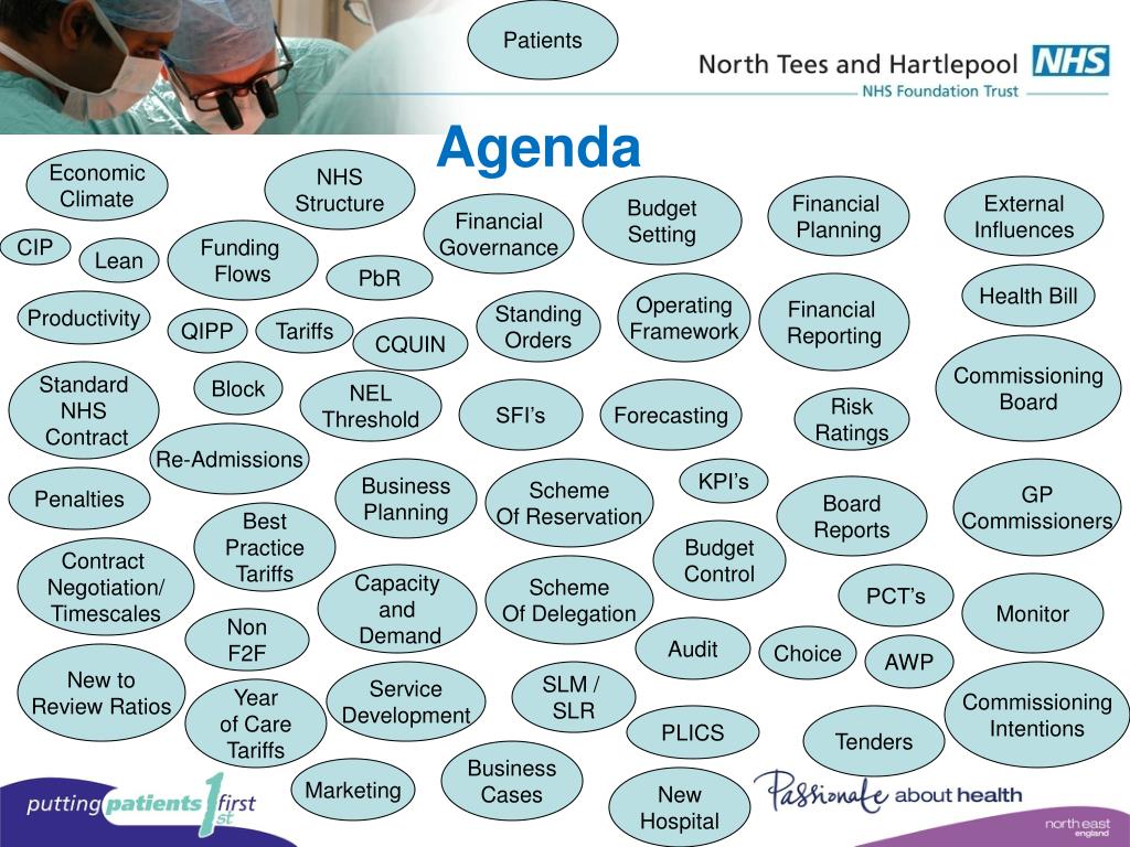 Patients Agenda Economic Climate NHS Structure Budget Setting Financial Planning External Influences Financial Governance Funding Flows CIP Lean PbR Health Bill Operating Framework Financial Reporting Productivity Standing Orders QIPP Tariffs CQUIN Commissioning Board Standard NHS Contract Block NEL Threshold SFI’s Forecasting Risk Ratings Re-Admissions Business Planning Scheme Of Reservation KPI’s GP Commissioners Penalties Board Reports Best Practice Tariffs Budget Control Contract Negotiation/ Timescales Scheme Of Delegation Capacity and Demand PCT’s Monitor Non F2F Audit Choice AWP New to Review Ratios Service Development SLM / SLR Commissioning Intentions Year of Care Tariffs PLICS Tenders Business Cases Marketing New Hospital