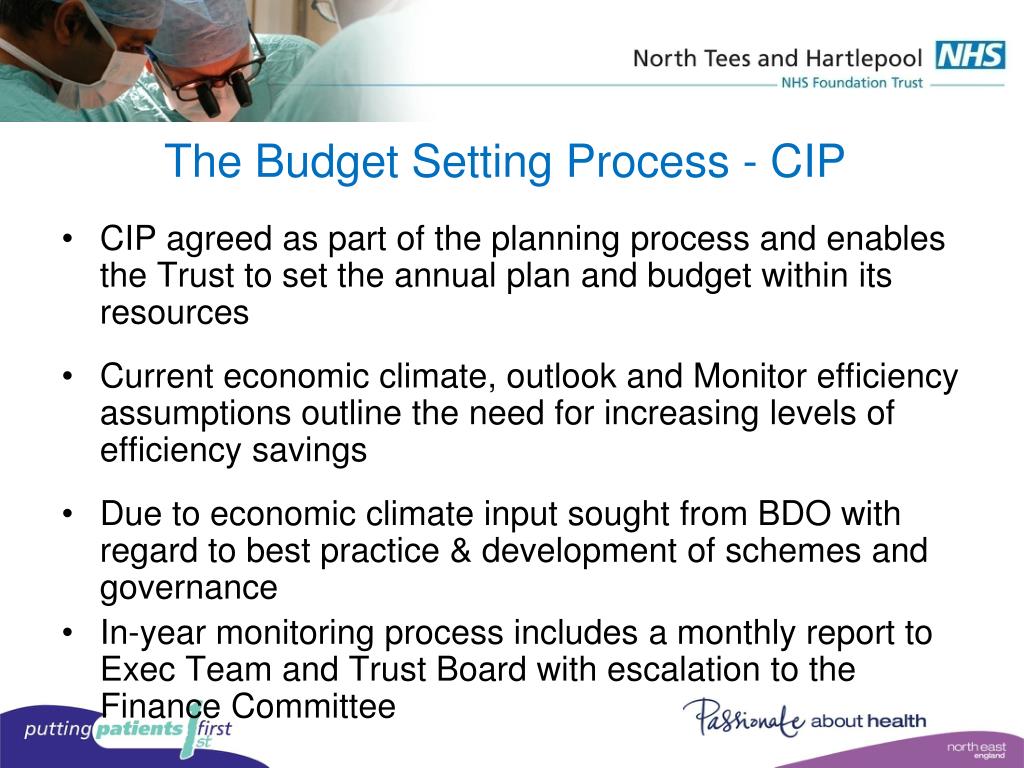 The Budget Setting Process - CIP • CIP agreed as part of the planning process and enables the Trust to set the annual plan and budget within its resources • Current economic climate, outlook and Monitor efficiency assumptions outline the need for increasing levels of efficiency savings • Due to economic climate input sought from BDO with regard to best practice & development of schemes and governance • In-year monitoring process includes a monthly report to Exec Team and Trust Board with escalation to the Finance Committee