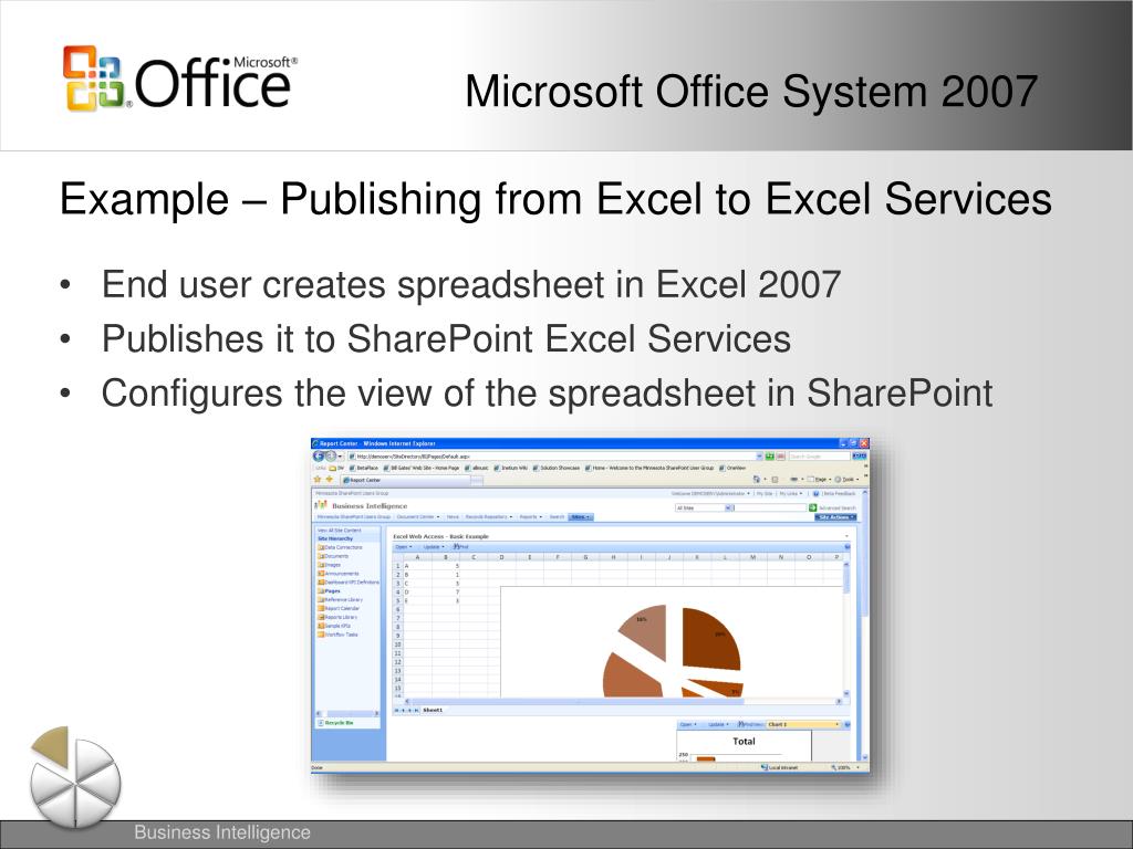 Example – Publishing from Excel to Excel Services • End user creates spreadsheet in Excel 2007 • Publishes it to SharePoint Excel Services • Configures the view of the spreadsheet in SharePoint Business Intelligence