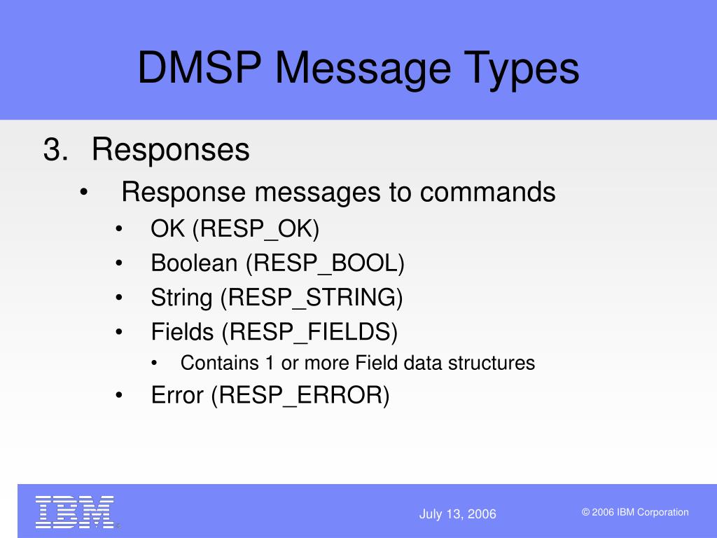 DMSP Message Types • Responses • Response messages to commands • OK (RESP_OK) • Boolean (RESP_BOOL) • String (RESP_STRING) • Fields (RESP_FIELDS) • Contains 1 or more Field data structures • Error (RESP_ERROR)