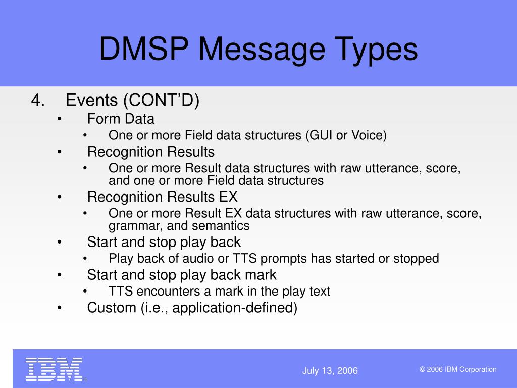 DMSP Message Types • Events • Asynchronous notifications between user agents with a common data structure • Events correlated with event listeners • DOM events • DOMActivate, DOMFocusIn, and DOMFocusOut • HTML 4 events • Click, Mouse, Key, submit, reset, etc • Error and abort • VXML Done (e.g., VoiceXML form complete)