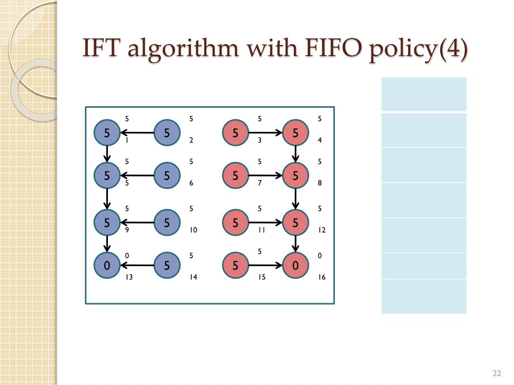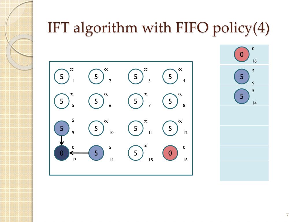 IFT algorithm with FIFO policy(4) ∝ ∝ ∝ ∝ 5 5 5 5 1 2 3 4 5 ∝ ∝ ∝ 5 5 5 5 5 6 7 8 5 5 ∝ 5 5 5 5 5 9 10 11 12 5 0 5 0 0 5 5 0 13 14 15 16 5 5 5 5 5 5 5 5 12 5 15 10
