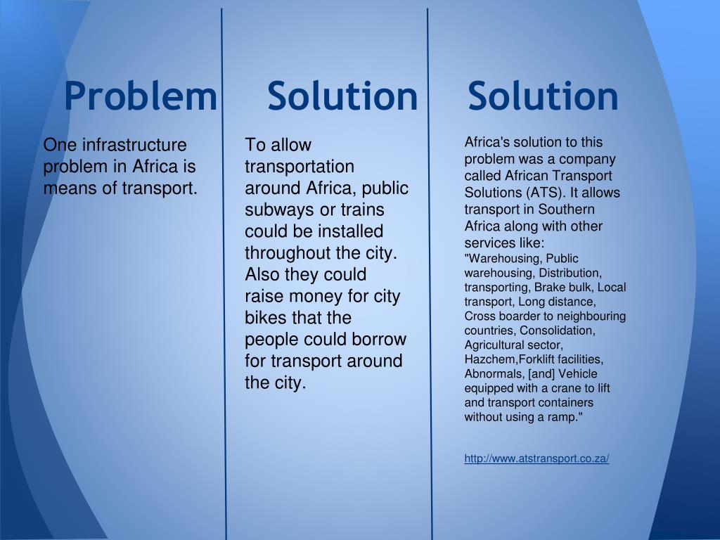 Problem Solution Solution One infrastructure problem in Africa is means of transport. To allow transportation around Africa, public subways or trains could be installed throughout the city. Also they could raise money for city bikes that the people could borrow for transport around the city. Africa's solution to this problem was a company called African Transport Solutions (ATS). It allows transport in Southern Africa along with other services like: "Warehousing, Public warehousing, Distribution, transporting, Brake bulk, Local transport, Long distance, Cross boarder to neighbouring countries, Consolidation, Agricultural sector, Hazchem,Forklift facilities, Abnormals, [and] Vehicle equipped with a crane to lift and transport containers without using a ramp." http://www.atstransport.co.za/