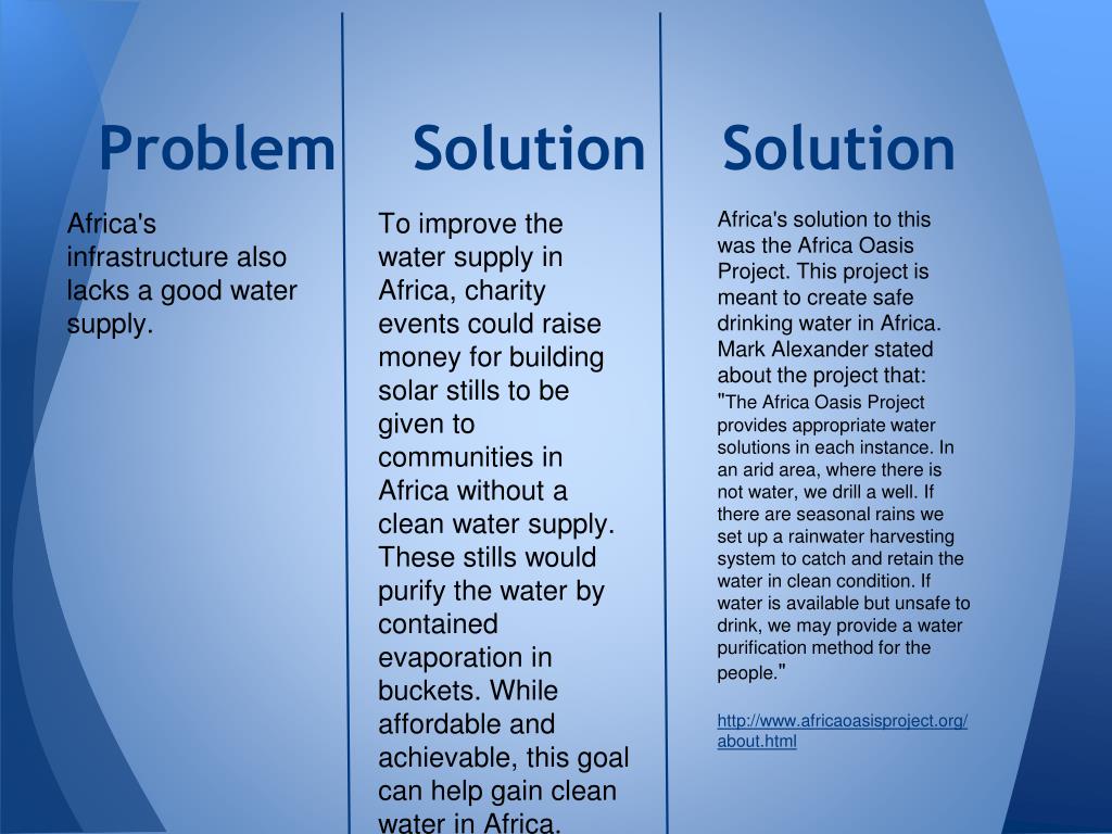 Problem Solution Solution Africa's infrastructure also lacks a good water supply. To improve the water supply in Africa, charity events could raise money for building solar stills to be given to communities in Africa without a clean water supply. These stills would purify the water by contained evaporation in buckets. While affordable and achievable, this goal can help gain clean water in Africa. Africa's solution to this was the Africa Oasis Project. This project is meant to create safe drinking water in Africa. Mark Alexander stated about the project that: "The Africa Oasis Project provides appropriate water solutions in each instance. In an arid area, where there is not water, we drill a well. If there are seasonal rains we set up a rainwater harvesting system to catch and retain the water in clean condition. If water is available but unsafe to drink, we may provide a water purification method for the people." http://www.africaoasisproject.org/about.html