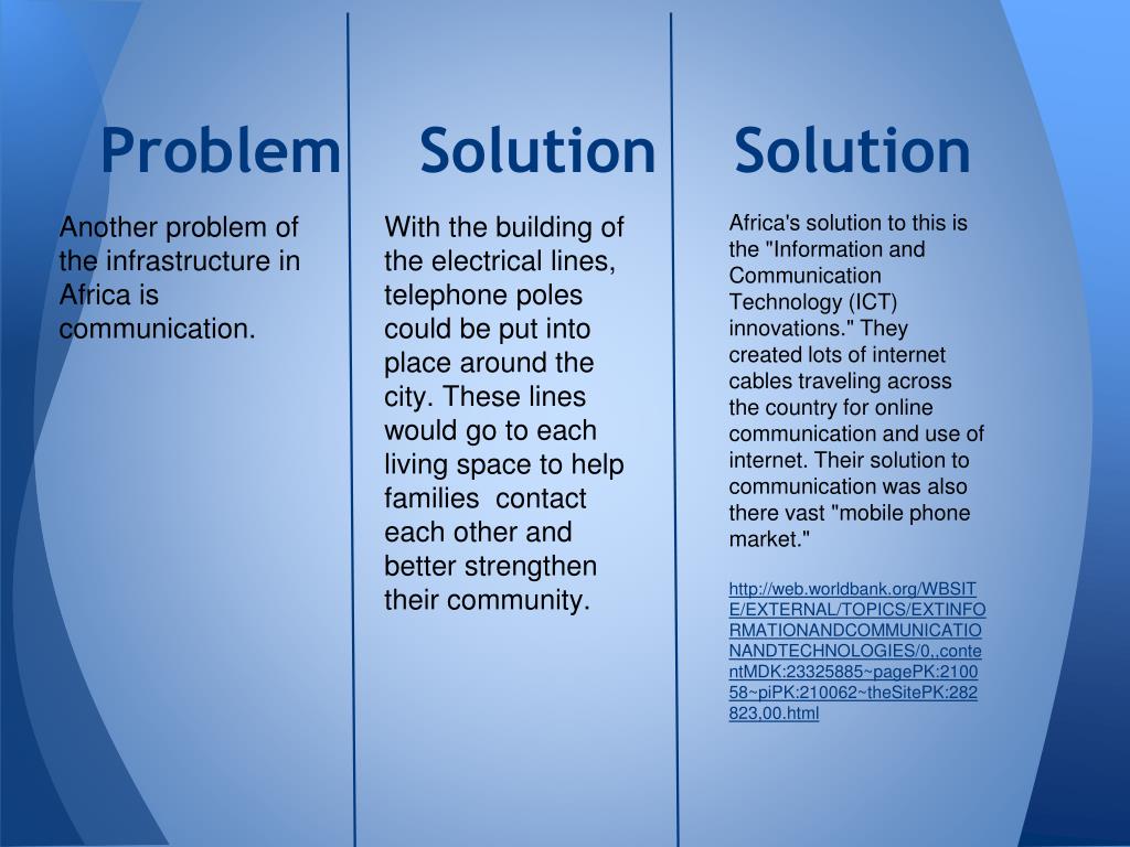 Problem Solution Solution Another problem of the infrastructure in Africa is communication. With the building of the electrical lines, telephone poles could be put into place around the city. These lines would go to each living space to help families contact each other and better strengthen their community. Africa's solution to this is the "Information and Communication Technology (ICT) innovations." They created lots of internet cables traveling across the country for online communication and use of internet. Their solution to communication was also there vast "mobile phone market." http://web.worldbank.org/WBSITE/EXTERNAL/TOPICS/EXTINFORMATIONANDCOMMUNICATIONANDTECHNOLOGIES/0,,contentMDK:23325885~pagePK:210058~piPK:210062~theSitePK:282823,00.html
