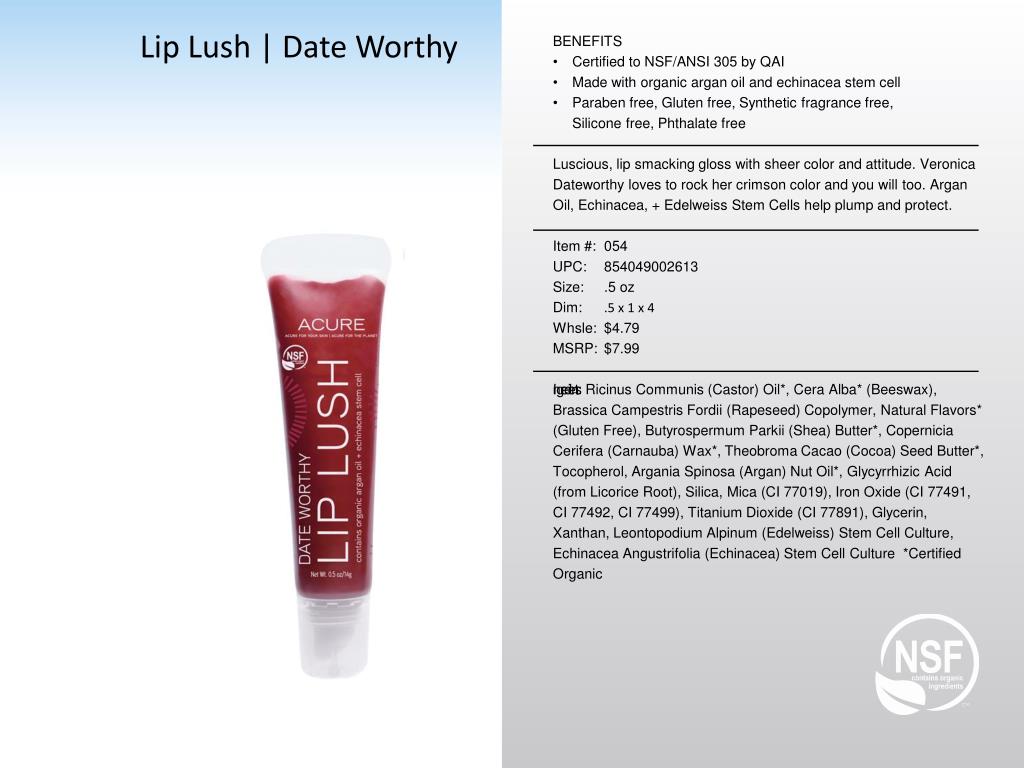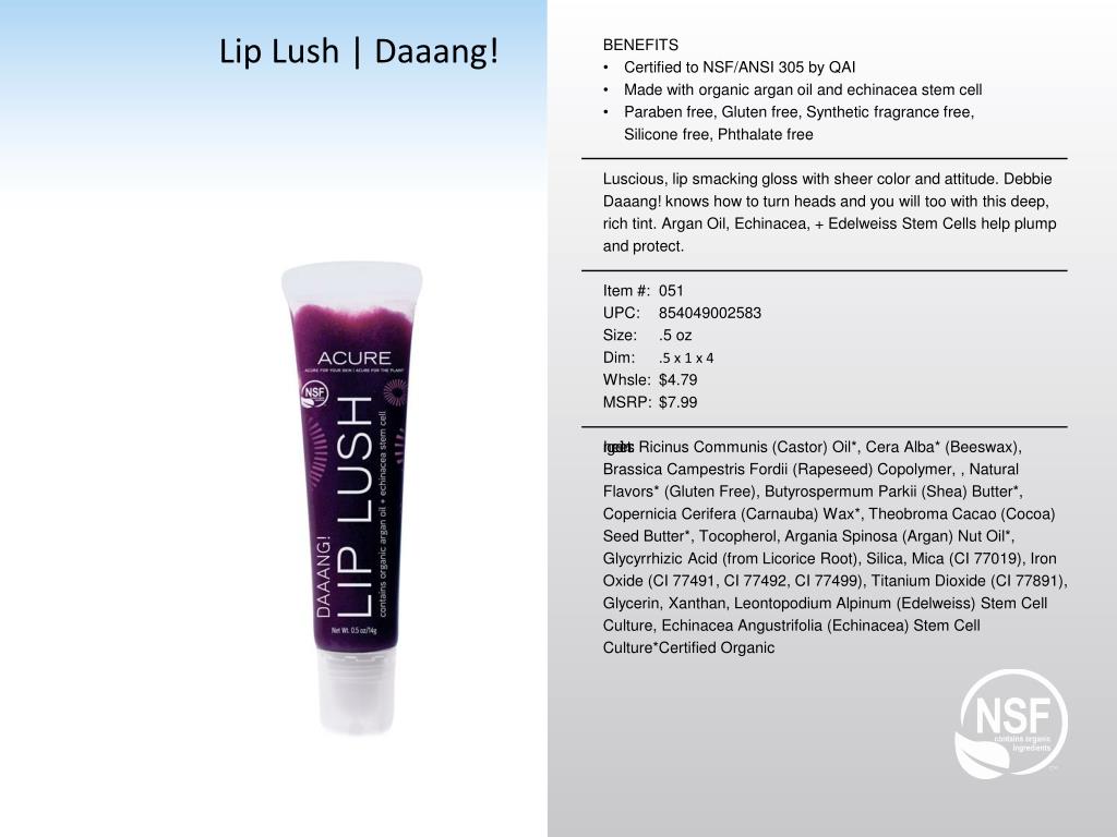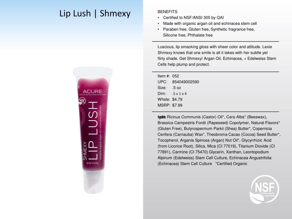 Lip Lush | Shmexy. BENEFITS Certified to NSF/ANSI 305 by QAI Made with organic argan oil and echinacea stem cell Paraben free, Gluten free, Synthetic fragrance free , Silicone free, Phthalate free