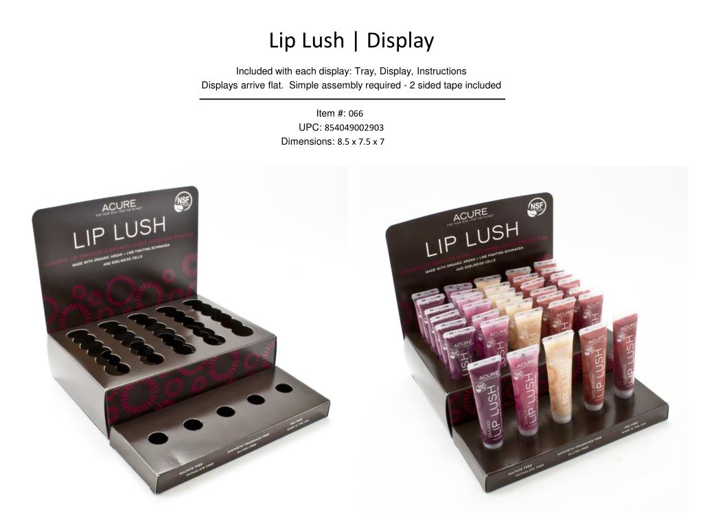 Lip Lush | Display • Included with each display: Tray, Display, Instructions • Displays arrive flat. Simple assembly required - 2 sided tape included • Item #: 066 • UPC: 854049002903 • Dimensions: 8.5 x 7.5 x 7