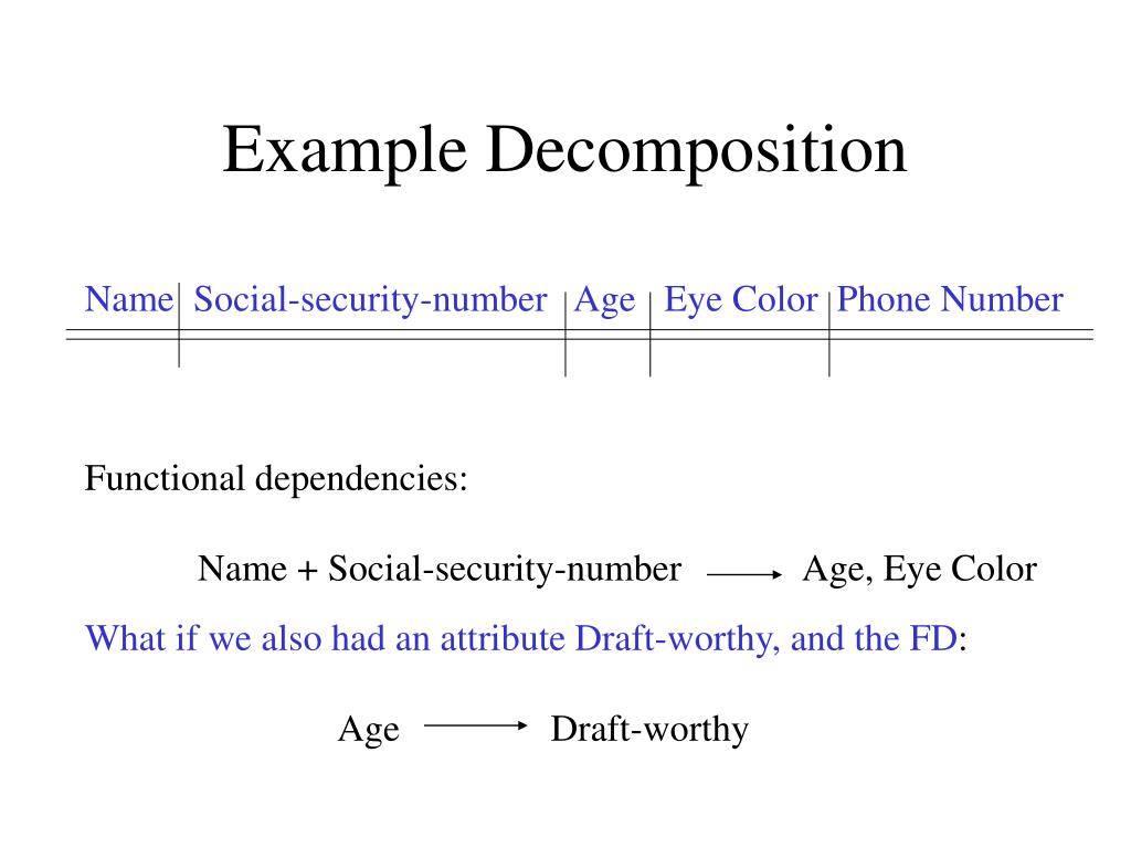 Example Decomposition Name Social-security-number Age Eye Color Phone Number Functional dependencies: Name + Social-security-number Age, Eye Color What if we also had an attribute Draft-worthy, and the FD: Age Draft-worthy