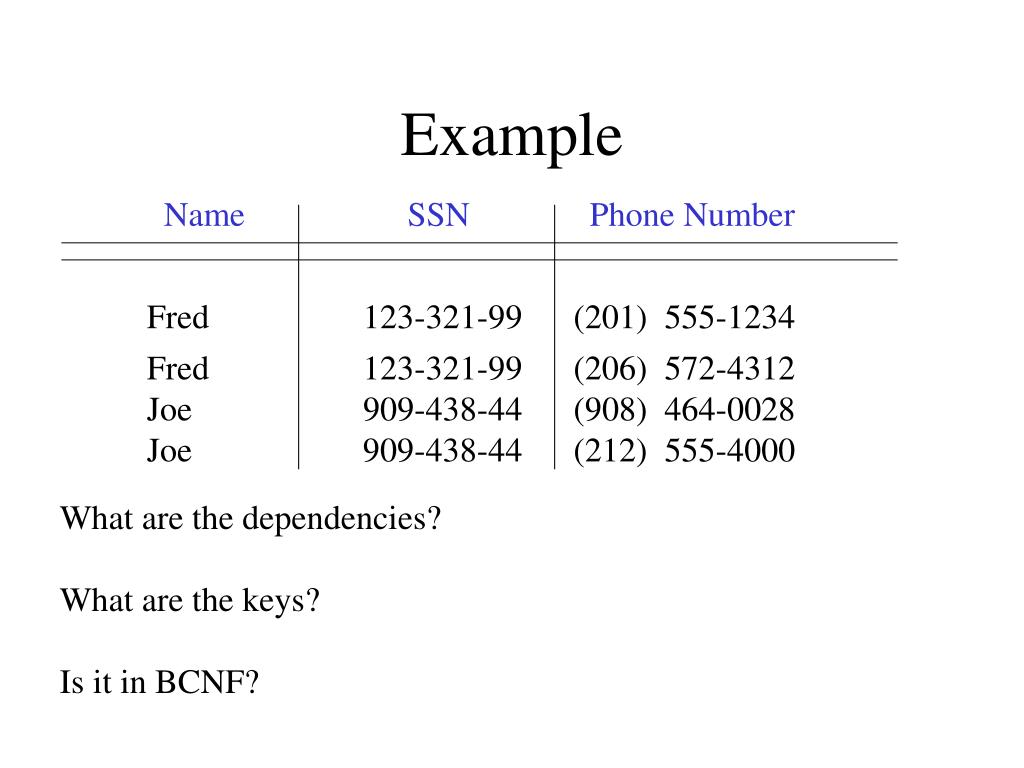 Example Name SSN Phone Number Fred 123-321-99 (201) 555-1234 Fred 123-321-99 (206) 572-4312 Joe 909-438-44 (908) 464-0028 Joe 909-438-44 (212) 555-4000 What are the dependencies? What are the keys? Is it in BCNF?
