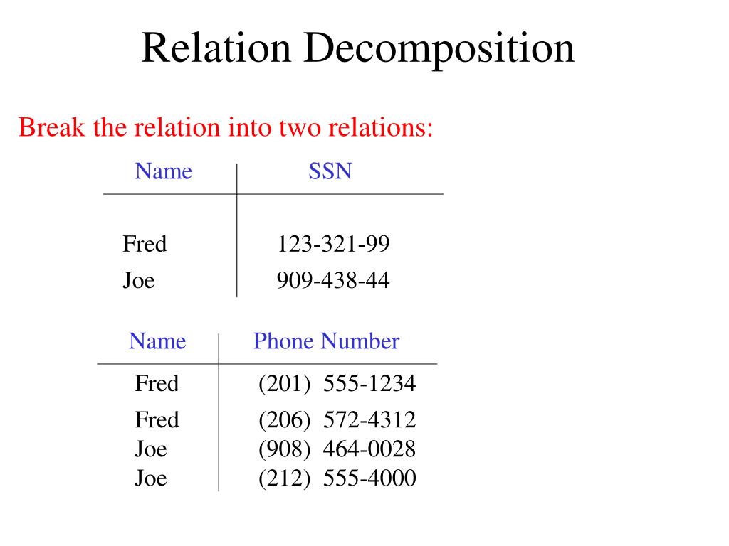 Relation Decomposition Break the relation into two relations: Name SSN Fred 123-321-99 Joe 909-438-44 Name Phone Number Fred (201) 555-1234 Fred (206) 572-4312 Joe (908) 464-0028 Joe (212) 555-4000
