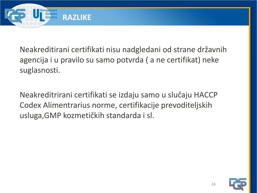RAZLIKE Neakreditirani certifikati nisu nadgledani od strane državnih agencija i u pravilo su samo potvrda ( a ne certifikat) neke suglasnosti. Neakreditrirani certifikati se izdaju samo u slučaju HACCP Codex Alimentrarius norme, certifikacije prevoditeljskih usluga,GMP kozmetičkih standarda i sl.