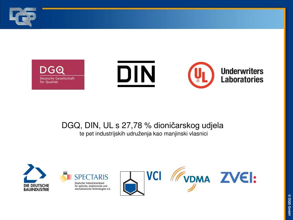 DGQ, DIN, UL s 27,78 % dioničarskog udjelate pet industrijskih udruženja kao manjinski vlasnici