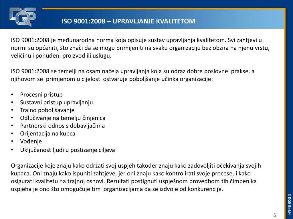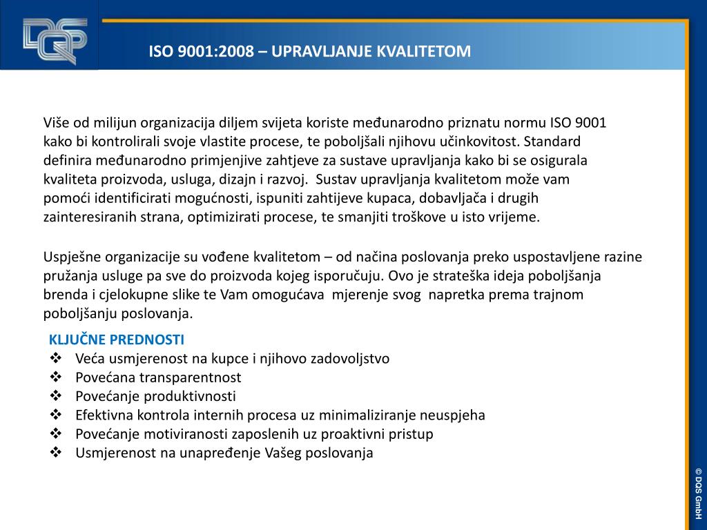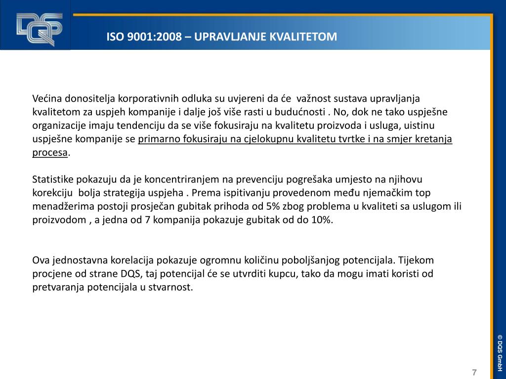ISO 9001:2008 – UPRAVLJANJE KVALITETOM • Većina donositelja korporativnih odluka su uvjereni da će važnost sustava upravljanja kvalitetom za uspjeh kompanije i dalje još više rasti u budućnosti . No, dok ne tako uspješne organizacije imaju tendenciju da se više fokusiraju na kvalitetu proizvoda i usluga, uistinu uspješne kompanije se primarno fokusiraju na cjelokupnu kvalitetu tvrtke i na smjer kretanja procesa. • Statistike pokazuju da je koncentriranjem na prevenciju pogrešaka umjesto na njihovu korekciju bolja strategija uspjeha . Prema ispitivanju provedenom među njemačkim top menadžerima postoji prosječan gubitak prihoda od 5% zbog problema u kvaliteti sa uslugom ili proizvodom , a jedna od 7 kompanija pokazuje gubitak od do 10%. • Ova jednostavna korelacija pokazuje ogromnu količinu poboljšanjog potencijala. Tijekom procjene od strane DQS, taj potencijal će se utvrditi kupcu, tako da mogu imati koristi od pretvaranja potencijala u stvarnost.