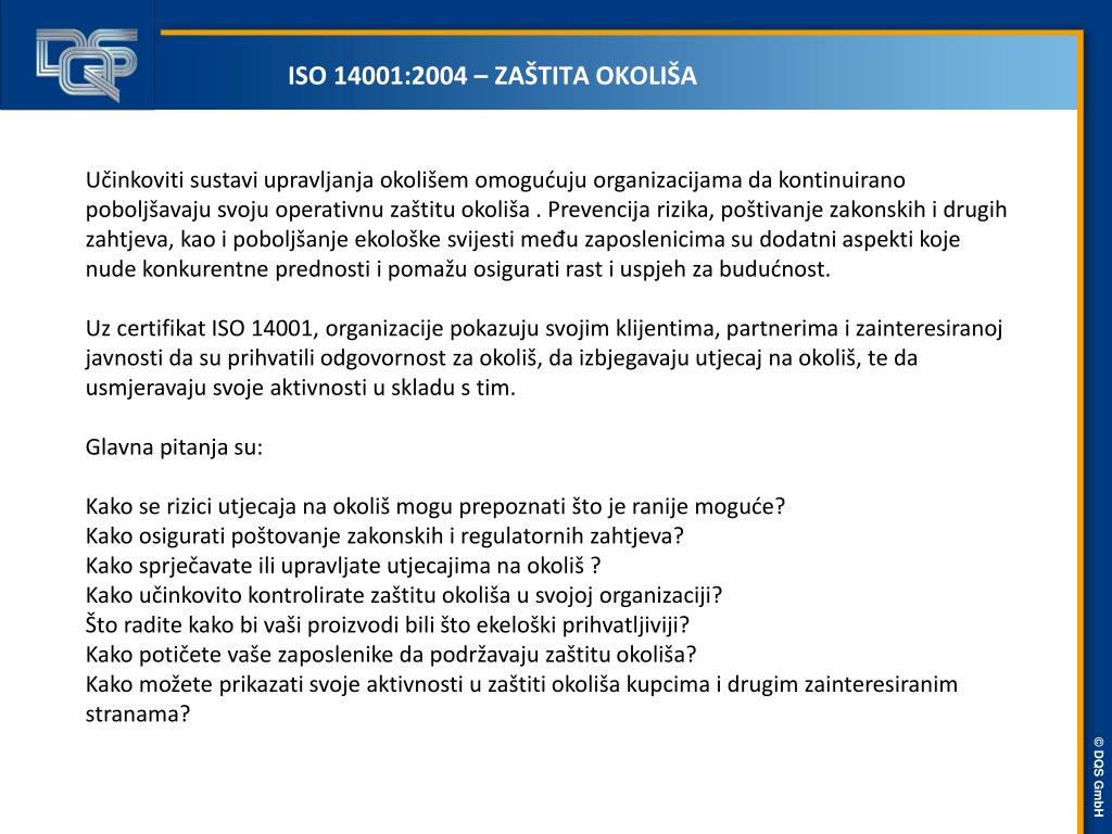 ISO 14001:2004 – ZAŠTITA OKOLIŠA Učinkoviti sustavi upravljanja okolišem omogućuju organizacijama da kontinuirano poboljšavaju svoju operativnu zaštitu okoliša . Prevencija rizika, poštivanje zakonskih i drugih zahtjeva, kao i poboljšanje ekološke svijesti među zaposlenicima su dodatni aspekti koje nude konkurentne prednosti i pomažu osigurati rast i uspjeh za budućnost. Uz certifikat ISO 14001, organizacije pokazuju svojim klijentima, partnerima i zainteresiranoj javnosti da su prihvatili odgovornost za okoliš, da izbjegavaju utjecaj na okoliš, te da usmjeravaju svoje aktivnosti u skladu s tim. Glavna pitanja su: Kako se rizici utjecaja na okoliš mogu prepoznati što je ranije moguće? Kako osigurati poštovanje zakonskih i regulatornih zahtjeva? Kako sprječavate ili upravljate utjecajima na okoliš ? Kako učinkovito kontrolirate zaštitu okoliša u svojoj organizaciji? Što radite kako bi vaši proizvodi bili što ekeloški prihvatljiviji? Kako potičete vaše zaposlenike da podržavaju zaštitu okoliša? Kako možete prikazati svoje aktivnosti u zaštiti okoliša kupcima i drugim zainteresiranim stranama?