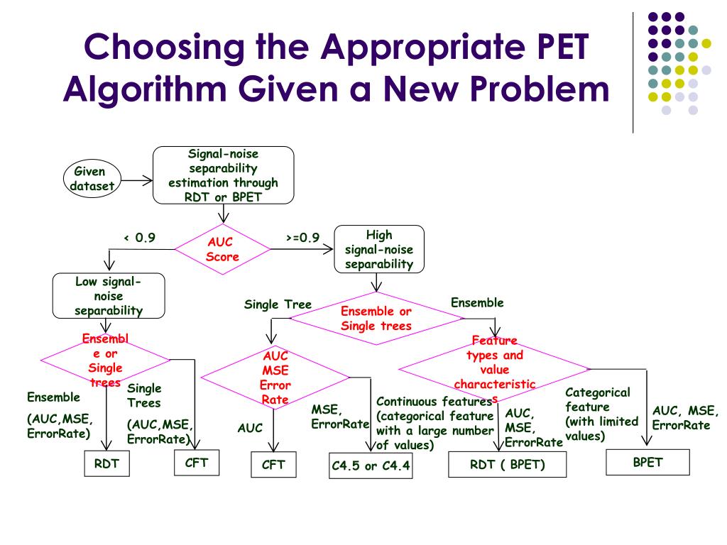 Choosing the Appropriate PET Algorithm Given a New Problem Signal-noise separability estimation through RDT or BPET Given dataset AUC Score High signal-noise separability < 0.9 >=0.9 Low signal-noise separability Ensemble Ensemble or Single trees Single Tree Ensemble or Single trees Feature types and value characteristics AUC MSE Error Rate Single Trees (AUC,MSE,ErrorRate) Categorical feature (with limited values) Ensemble (AUC,MSE,ErrorRate) Continuous features (categorical feature with a large number of values) MSE, ErrorRate AUC, MSE, ErrorRate AUC, MSE, ErrorRate AUC BPET CFT RDT RDT ( BPET) CFT C4.5 or C4.4