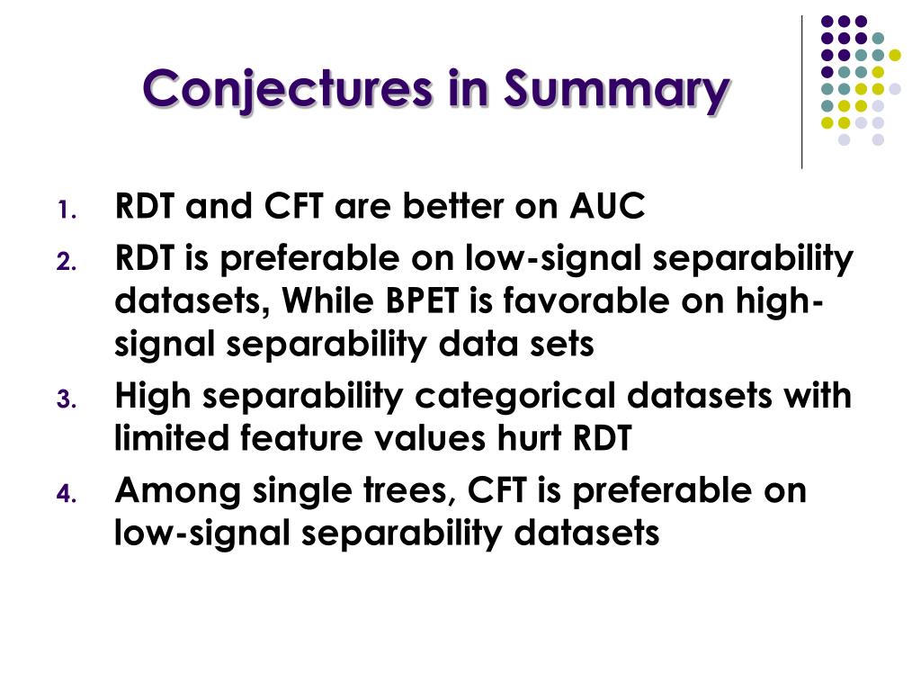 Conjectures in Summary • RDT and CFT are better on AUC • RDT is preferable on low-signal separability datasets, While BPET is favorable on high-signal separability data sets • High separability categorical datasets with limited feature values hurt RDT • Among single trees, CFT is preferable on low-signal separability datasets