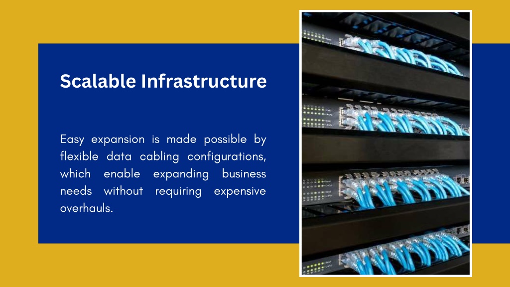 Scalable Infrastructure Easy expansion is made possible by flexible data cabling configurations, which enable expanding business needs without requiring expensive overhauls.