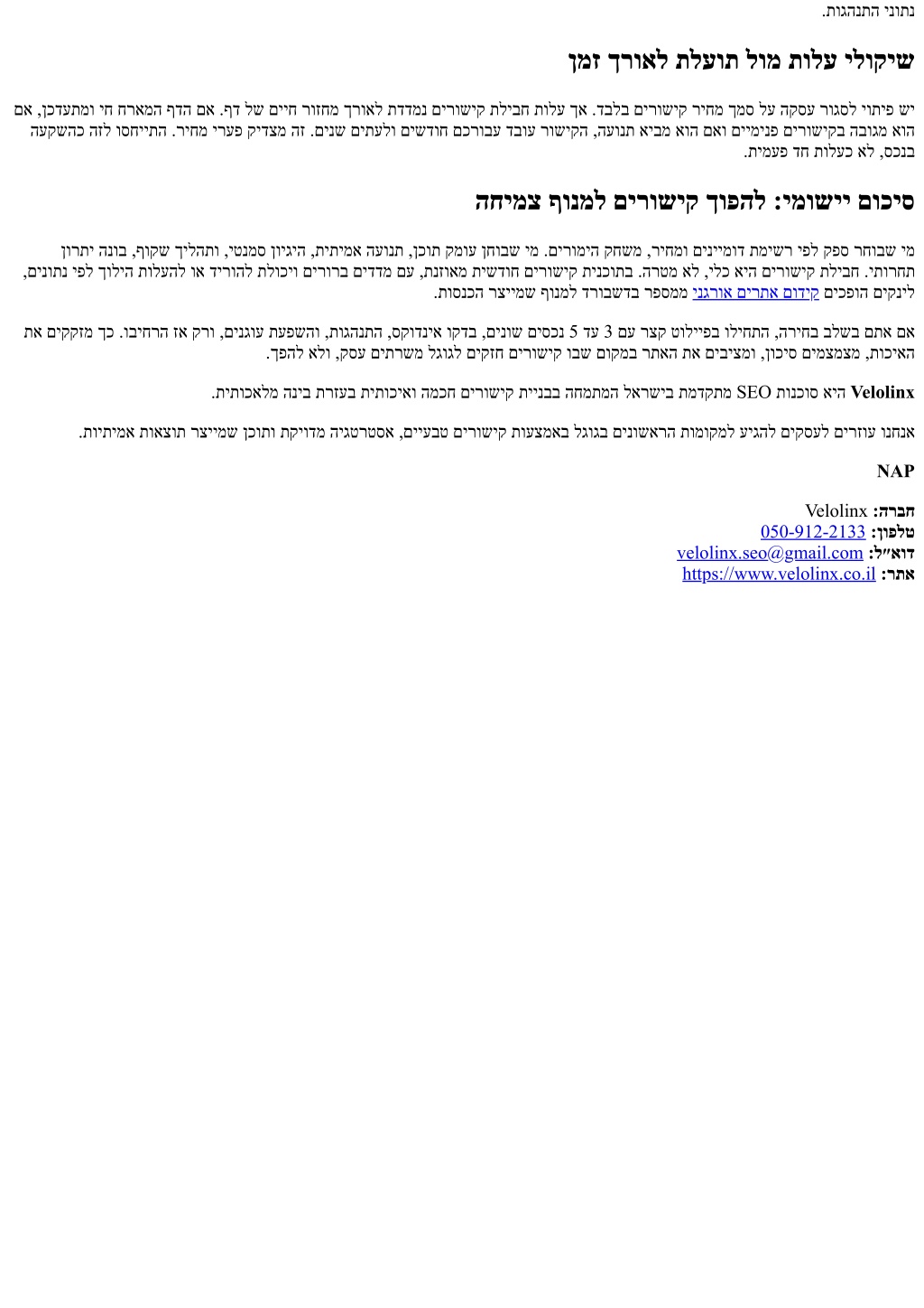 .תוגהנתה ינותנ ןמז ךרואל תלעות לומ תולע ילוקיש םא ,ןכדעתמו יח חראמה ףדה םא .ףד לש םייח רוזחמ ךרואל תדדמנ םירושיק תליבח תולע ךא .דבלב םירושיק ריחמ ךמס לע הקסע רוגסל יותיפ שי העקשהכ הזל וסחייתה .ריחמ ירעפ קידצמ הז .םינש םיתעלו םישדוח םכרובע דבוע רושיקה ,העונת איבמ אוה םאו םיימינפ םירושיקב הבוגמ אוה .תימעפ דח תולעכ אל ,סכנב החימצ ףונמל םירושיק ךופהל :ימושיי םוכיס ןורתי הנוב ,ףוקש ךילהתו ,יטנמס ןויגיה ,תיתימא העונת ,ןכות קמוע ןחובש ימ .םירומיה קחשמ ,ריחמו םיניימוד תמישר יפל קפס רחובש ימ ,םינותנ יפל ךוליה תולעהל וא דירוהל תלוכיו םירורב םידדמ םע ,תנזואמ תישדוח םירושיק תינכותב .הרטמ אל ,ילכ איה םירושיק תליבח .יתורחת .תוסנכה רציימש ףונמל דרובשדב רפסממ ינגרוא םירתא םודיק םיכפוה םיקניל תא םיקקזמ ךכ .וביחרה זא קרו ,םינגוע תעפשהו ,תוגהנתה ,סקודניא וקדב ,םינוש םיסכנ 5 דע 3 םע רצק טולייפב וליחתה ,הריחב בלשב םתא םא .ךפהל אלו ,קסע םיתרשמ לגוגל םיקזח םירושיק ובש םוקמב רתאה תא םיביצמו ,ןוכיס םימצמצמ ,תוכיאה .תיתוכאלמ הניב תרזעב תיתוכיאו המכח םירושיק תיינבב החמתמה לארשיב תמדקתמ SEO תונכוס איה Velolinx .תויתימא תואצות רציימש ןכותו תקיודמ היגטרטסא ,םייעבט םירושיק תועצמאב לגוגב םינושארה תומוקמל עיגהל םיקסעל םירזוע ונחנא NAP Velolinx :הרבח 050-912-2133:ןופלט velolinx.seo@gmail.com:ל״אוד https://www.velolinx.co.il:רתא