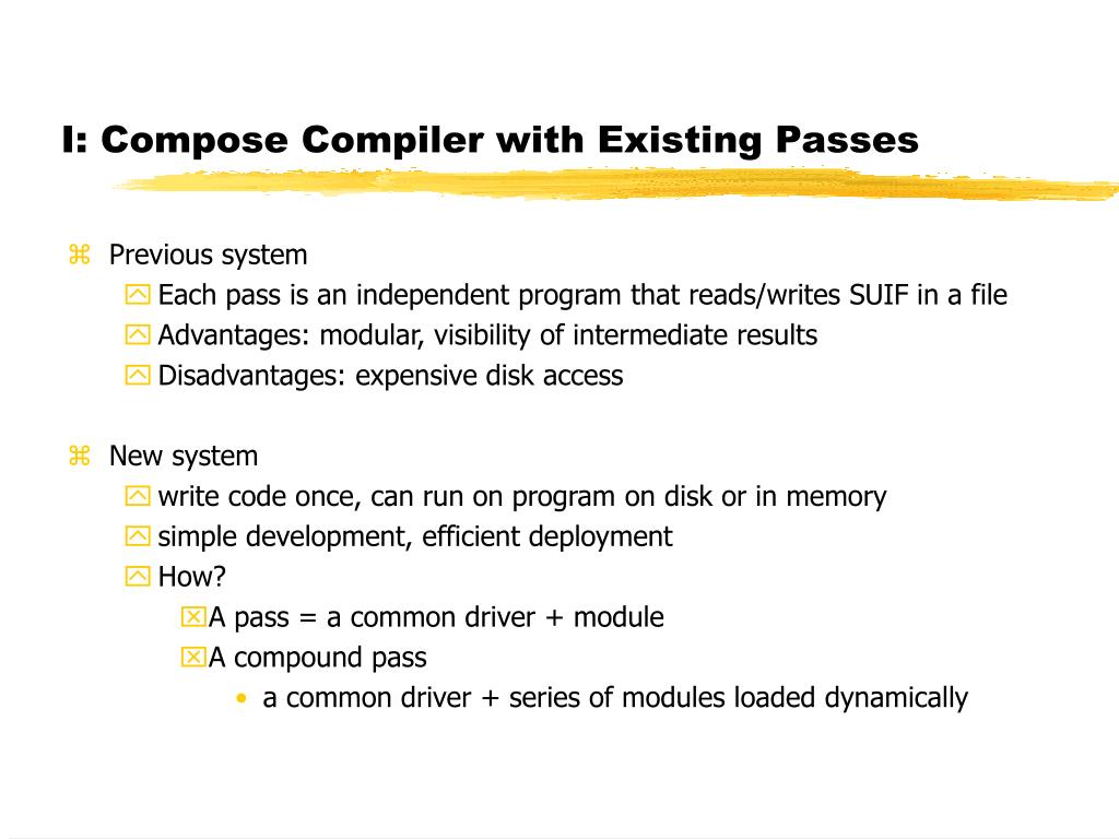 I: Compose Compiler with Existing Passes • Previous system • Each pass is an independent program that reads/writes SUIF in a file • Advantages: modular, visibility of intermediate results • Disadvantages: expensive disk access • New system • write code once, can run on program on disk or in memory • simple development, efficient deployment • How? • A pass = a common driver + module • A compound pass • a common driver + series of modules loaded dynamically
