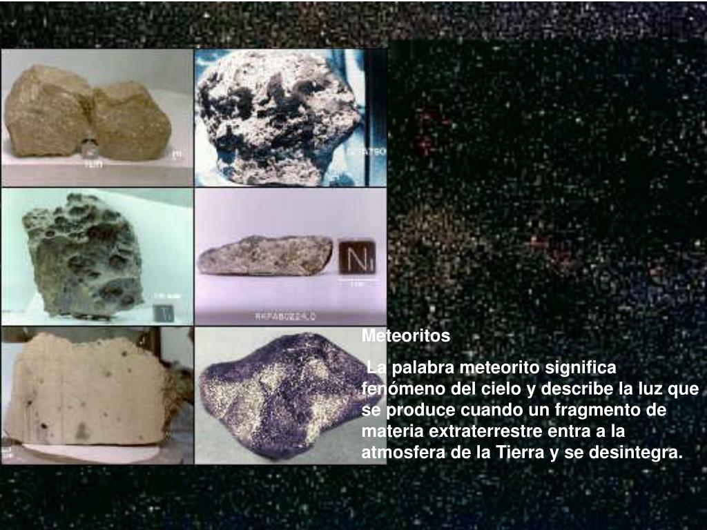 Meteoritos La palabra meteorito significa fenómeno del cielo y describe la luz que se produce cuando un fragmento de materia extraterrestre entra a la atmosfera de la Tierra y se desintegra.