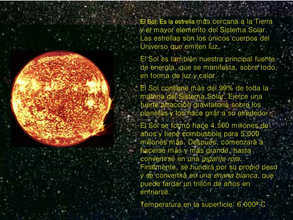 El Sol: Es la estrella más cercana a la Tierra y el mayor elemento del Sistema Solar. Las estrellas son los únicos cuerpos del Universo que emiten luz. El Sol es también nuestra principal fuente de energía, que se manifesta, sobre todo, en forma de luz y calor. El Sol contiene más del 99% de toda la materia del Sistema Solar. Ejerce una fuerte atracción gravitatoria sobre los planetas y los hace girar a su alrededor. El Sol se formó hace 4.500 millones de años y tiene combustible para 5.000 millones más. Después, comenzará a hacerse más y más grande, hasta convertirse en una gigante roja. Finalmente, se hundirá por su propio peso y se convertirá en una enana blanca, que puede tardar un trillón de años en enfriarse. Temperatura en la superficie: 6.000º C