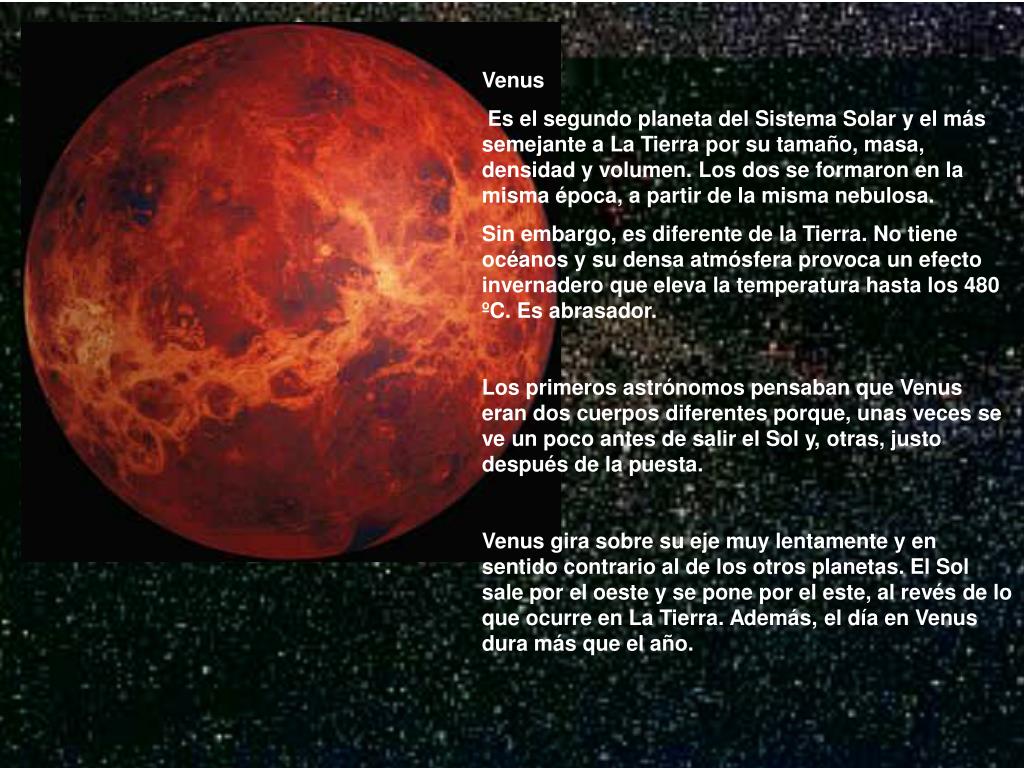 Venus Es el segundo planeta del Sistema Solar y el más semejante a La Tierra por su tamaño, masa, densidad y volumen. Los dos se formaron en la misma época, a partir de la misma nebulosa. Sin embargo, es diferente de la Tierra. No tiene océanos y su densa atmósfera provoca un efecto invernadero que eleva la temperatura hasta los 480 ºC. Es abrasador. Los primeros astrónomos pensaban que Venus eran dos cuerpos diferentes porque, unas veces se ve un poco antes de salir el Sol y, otras, justo después de la puesta. Venus gira sobre su eje muy lentamente y en sentido contrario al de los otros planetas. El Sol sale por el oeste y se pone por el este, al revés de lo que ocurre en La Tierra. Además, el día en Venus dura más que el año.
