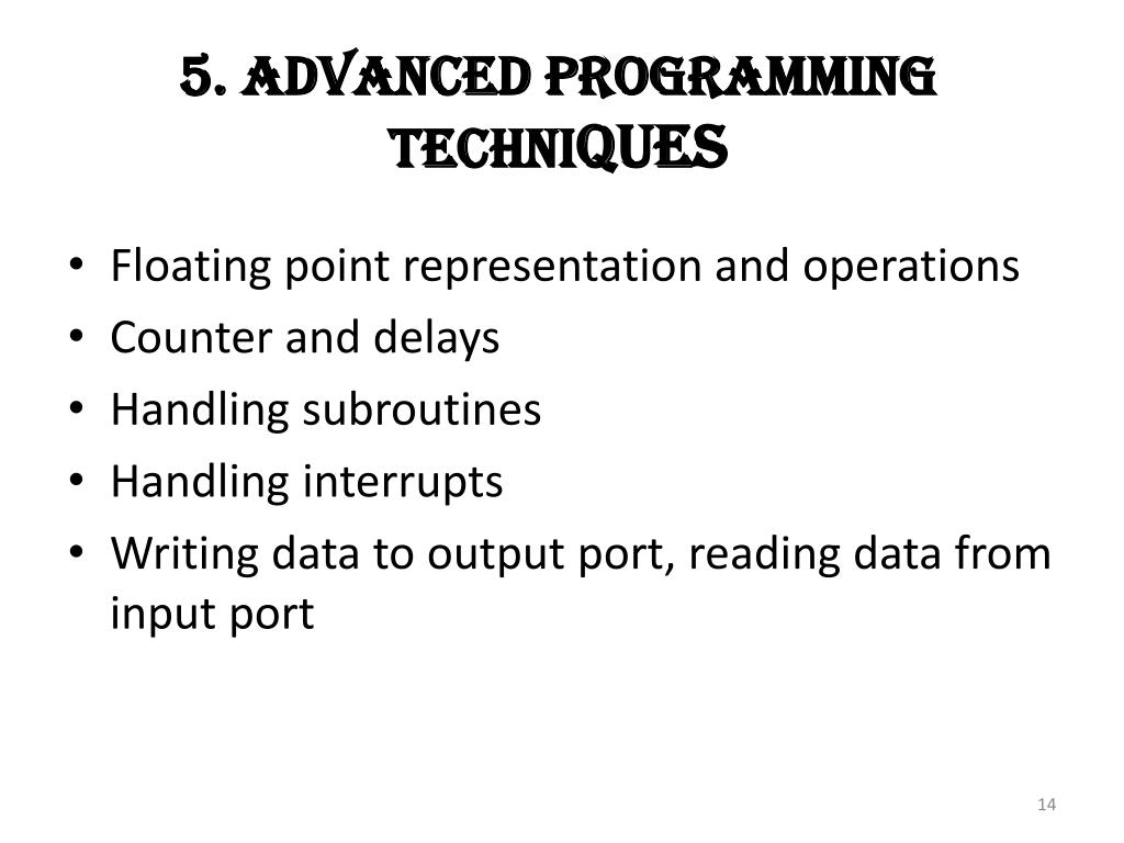 5. Advanced Programming Techniques • Floating point representation and operations • Counter and delays • Handling subroutines • Handling interrupts • Writing data to output port, reading data from input port