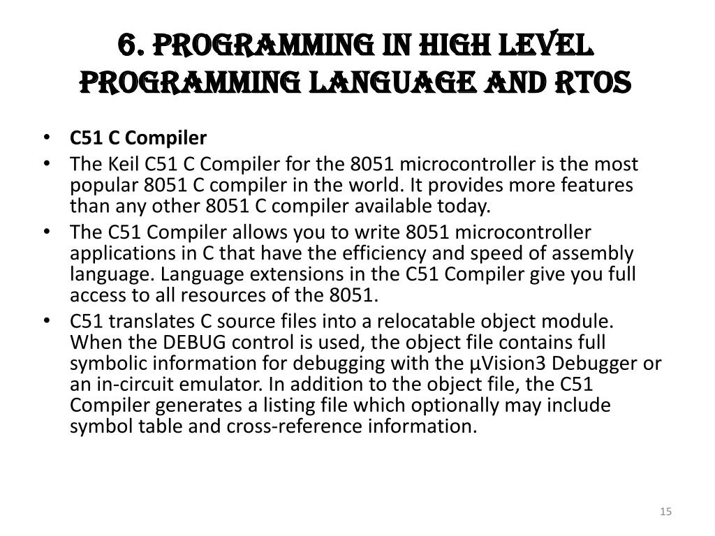 6. Programming In High Level Programming Language And Rtos • C51 C Compiler • The Keil C51 C Compiler for the 8051 microcontroller is the most popular 8051 C compiler in the world. It provides more features than any other 8051 C compiler available today. • The C51 Compiler allows you to write 8051 microcontroller applications in C that have the efficiency and speed of assembly language. Language extensions in the C51 Compiler give you full access to all resources of the 8051. • C51 translates C source files into a relocatable object module. When the DEBUG control is used, the object file contains full symbolic information for debugging with the µVision3 Debugger or an in-circuit emulator. In addition to the object file, the C51 Compiler generates a listing file which optionally may include symbol table and cross-reference information.