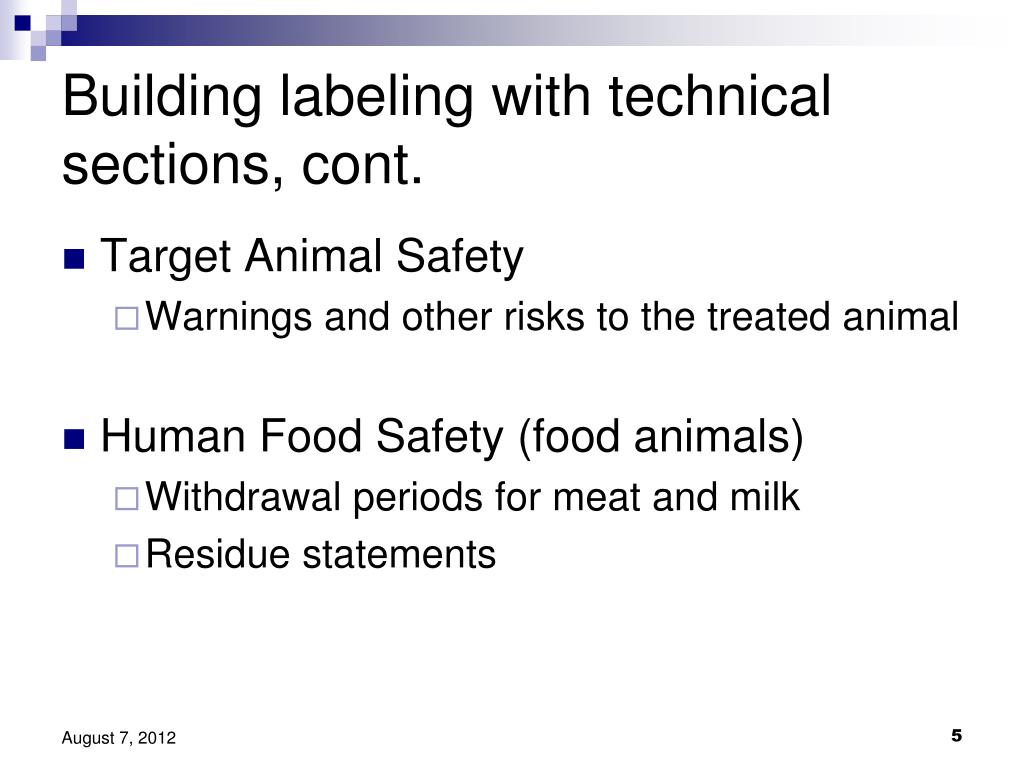 Building labeling with technical sections, cont. • Target Animal Safety • Warnings and other risks to the treated animal • Human Food Safety (food animals) • Withdrawal periods for meat and milk • Residue statements
