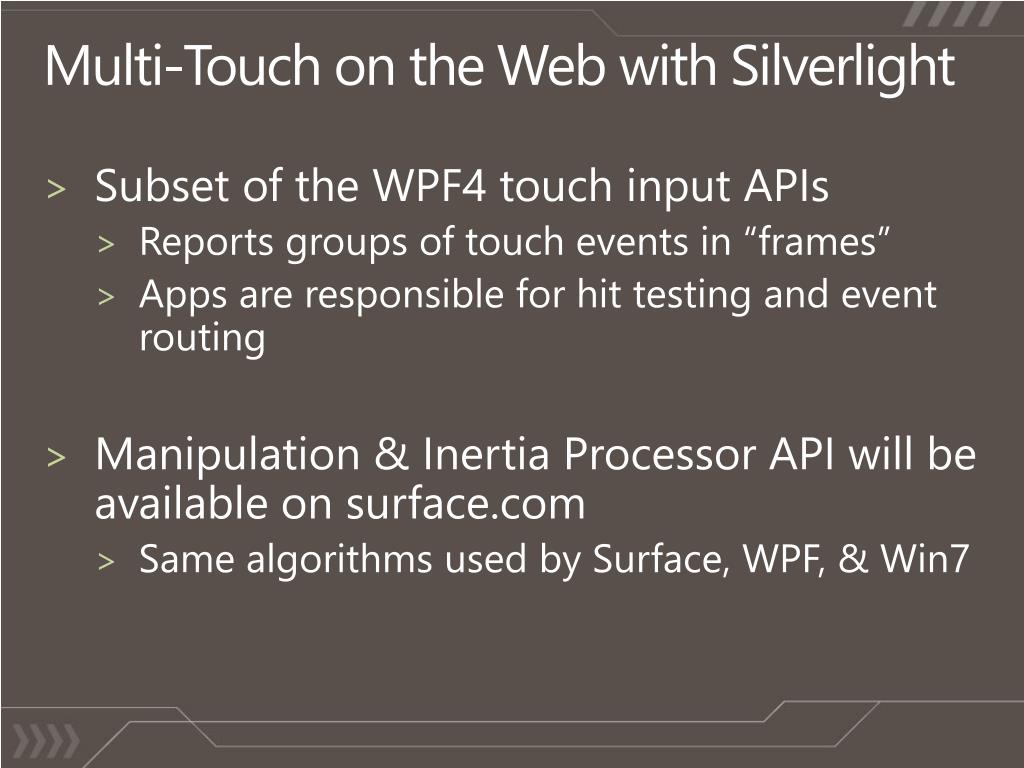 Multi-Touch on the Web with Silverlight • Subset of the WPF4 touch input APIs • Reports groups of touch events in “frames” • Apps are responsible for hit testing and event routing • Manipulation & Inertia Processor API will be available on surface.com • Same algorithms used by Surface, WPF, & Win7