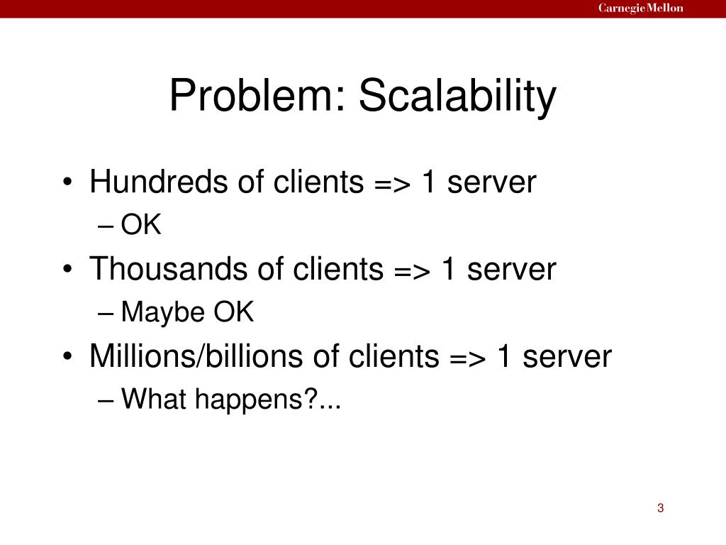 Problem: Scalability • Hundreds of clients => 1 server • OK • Thousands of clients => 1 server • Maybe OK • Millions/billions of clients => 1 server • What happens?...