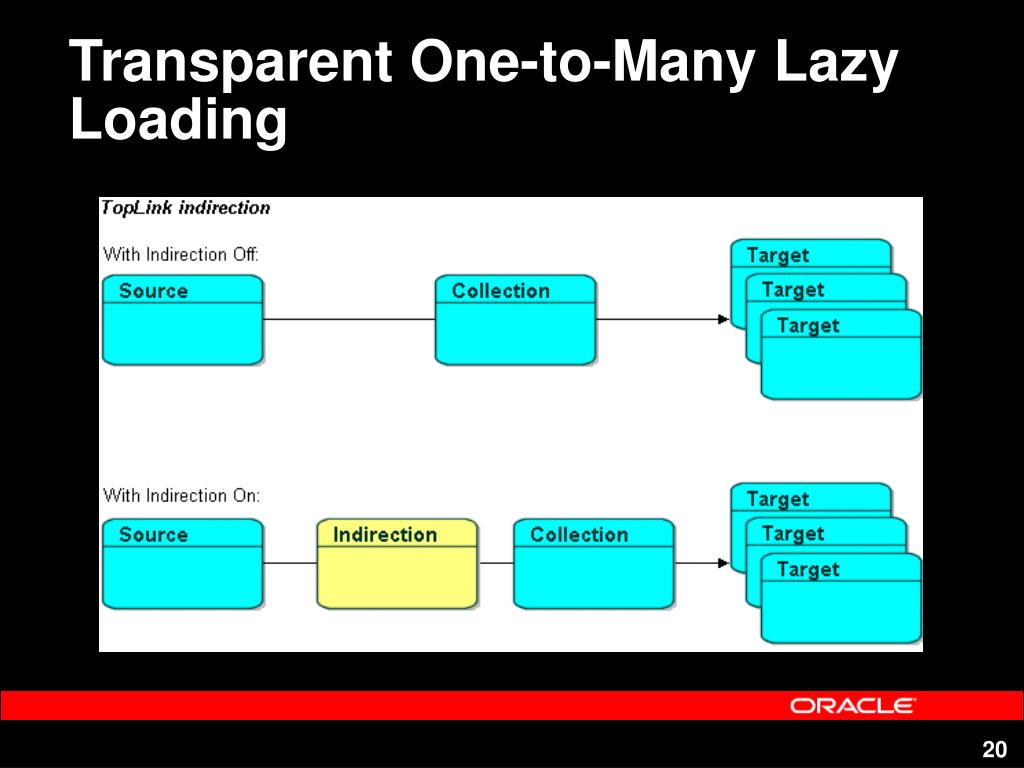 One-to-one • public class DomainA { ValueHolderInterface relation; public DomainB getRelation() { return (DomainB) relation.getValue(); } public void setRelation(DomainB newRel) { relation.setValue(newRel); }}