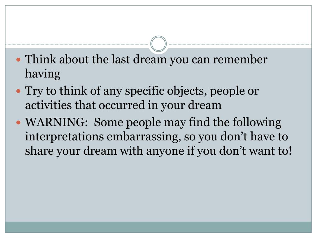 Think about the last dream you can remember having Try to think of any specific objects, people or activities that occurred in your dream WARNING: Some people may find the following interpretations embarrassing, so you don’t have to share your dream with anyone if you don’t want to!