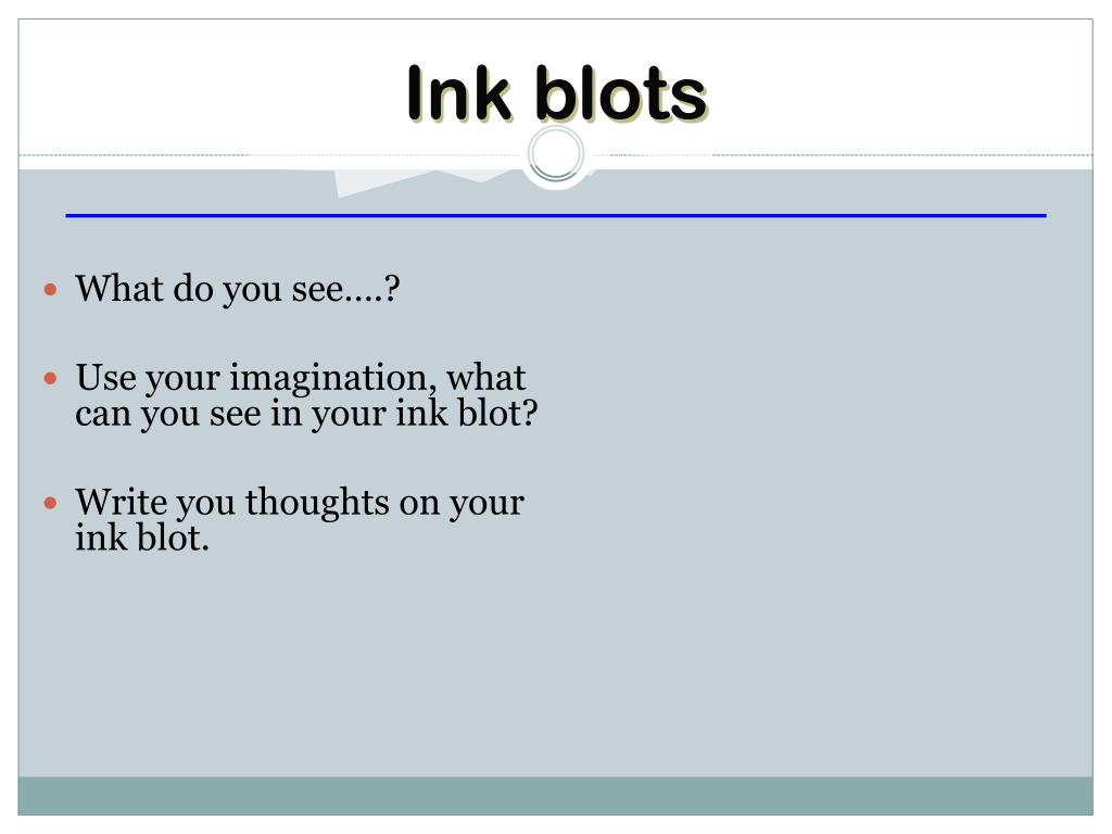 Ink blots • What do you see….? • Use your imagination, what can you see in your ink blot? • Write you thoughts on your ink blot.
