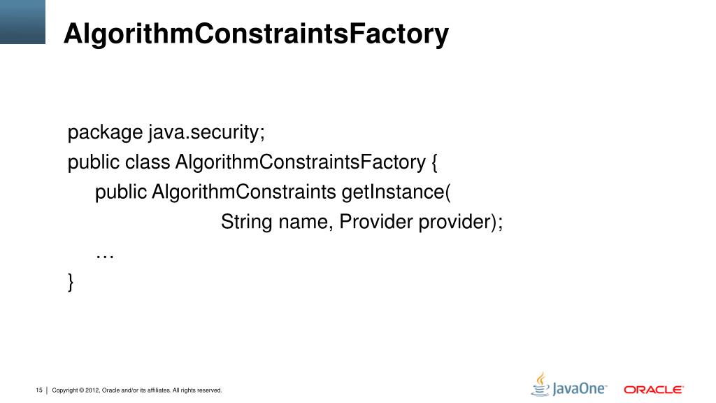 AlgorithmConstraintsFactory package java.security; public class AlgorithmConstraintsFactory{ public AlgorithmConstraintsgetInstance( String name, Provider provider); … }