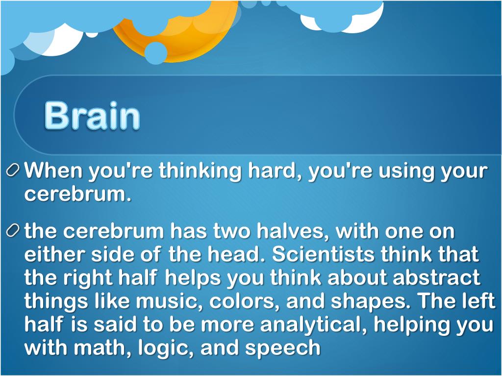Brain • When you're thinking hard, you're using your cerebrum. • the cerebrum has two halves, with one on either side of the head. Scientists think that the right half helps you think about abstract things like music, colors, and shapes. The left half is said to be more analytical, helping you with math, logic, and speech