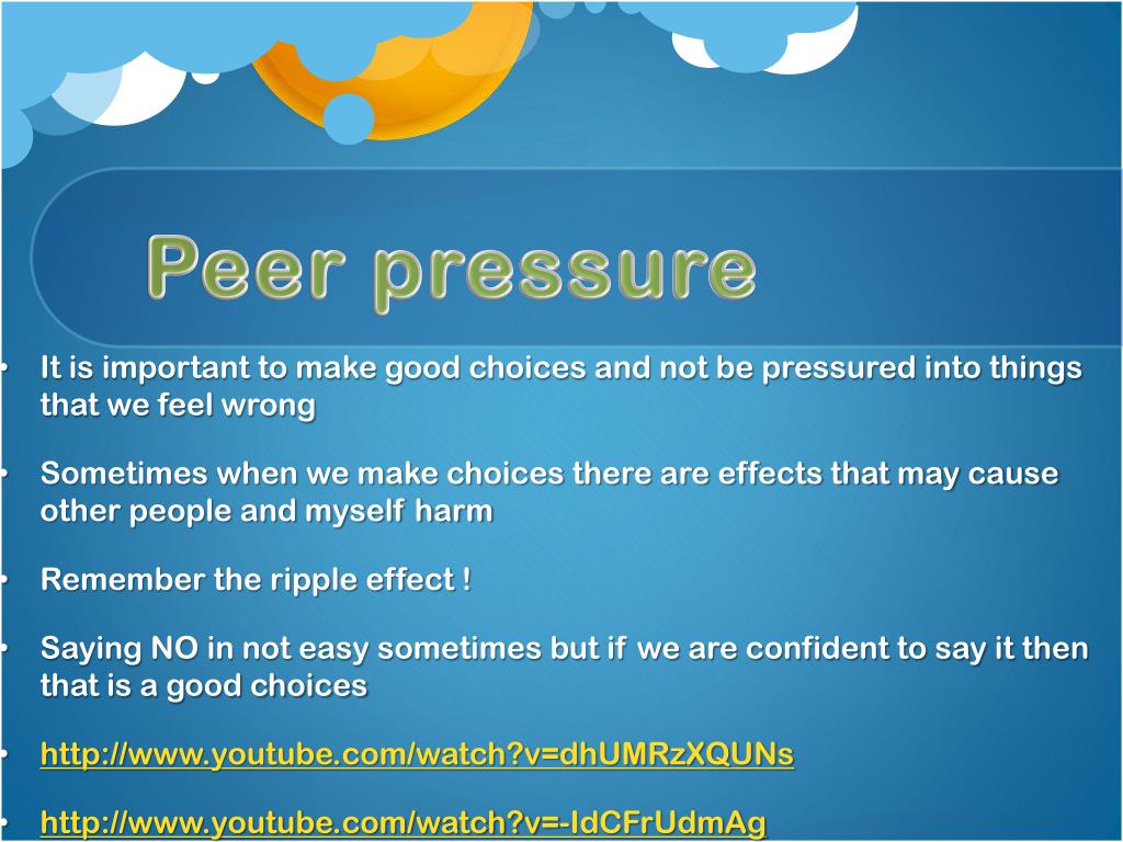 Peer pressure • It is important to make good choices and not be pressured into things that we feel wrong • Sometimes when we make choices there are effects that may cause other people and myself harm • Remember the ripple effect ! • Saying NO in not easy sometimes but if we are confident to say it then that is a good choices • http://www.youtube.com/watch?v=dhUMRzXQUNs • http://www.youtube.com/watch?v=-IdCFrUdmAg