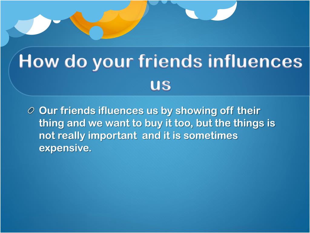 How do your friends influences us • Our friends ifluences us by showing off their thing and we want to buy it too, but the things is not really important and it is sometimes expensive.
