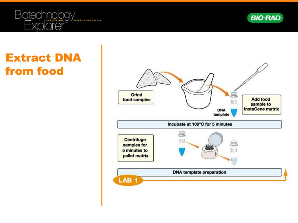 Why these steps? • Grinding food to release DNA • InstaGene chelates divalent ions (e.g. Mg2+) necessary for DNA degrading enzymes (e.g. DNases) • Only 50 μl of food transferred otherwise InstaGene is overwhelmed (~ 5 mg of original material) • Boiling releases DNA from food into the InstaGene solution • Pellet InstaGene and food debris because InstaGene inhibits PCR reaction (Taq needs Mg++) Mg++ Mg++ Mg++ Mg++ Mg++ Mg++ Mg++ Mg++ InstaGene
