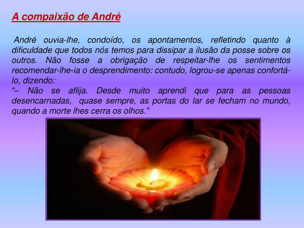 A compaixão de André André ouvia-lhe, condoído, os apontamentos, refletindo quanto à dificuldade que todos nós temos para dissipar a ilusão da posse sobre os outros. Não fosse a obrigação de respeitar-lhe os sentimentos recomendar-lhe-ia o desprendimento: contudo, logrou-se apenas confortá-lo, dizendo: “– Não se aflija. Desde muito aprendi que para as pessoas desencarnadas, quase sempre, as portas do lar se fecham no mundo, quando a morte lhes cerra os olhos.”